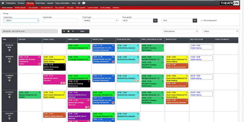 With Theatron you are able to manage artistic, technical and administrative personnel in a way that fulfills the unique needs of each person group. You manage all your venues and various spaces, plan all the events that take place - from premiers to yoga classes and from visiting shows to detailed tour schedules and so on.