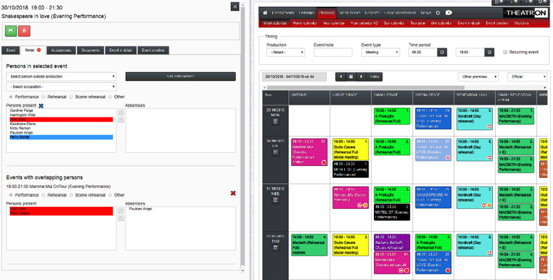 You manage yourself the event types that you want to plan and define how each event type is handled in Theatron. You are able to manage all the events that take place, performances, rehearsals, meetings, visiting performances, classes, room rentals and so on. Theatron also enables you to plan your tours as detailed as needed and also create detailed rehearsal schedules. There are planning calendars available for example daily, weekly, monthly, yearly, tour, department, holidays and reservations planning. All the calendars are connected and use the same centralized planning calendar, but separate views make it easy and efficient to manage different types of information.