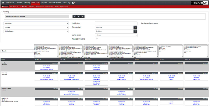 Roles and casts can be easily created and managed for each production. Actors can have make-up times before and after the show, you can create detailed rehearsal schedules and Theatron automatically checks that you don’t double book any of the artistic staff. For late changes in artistic schedules Theatron can automatically send an SMS alarm to the artistic staff notifying about the change.